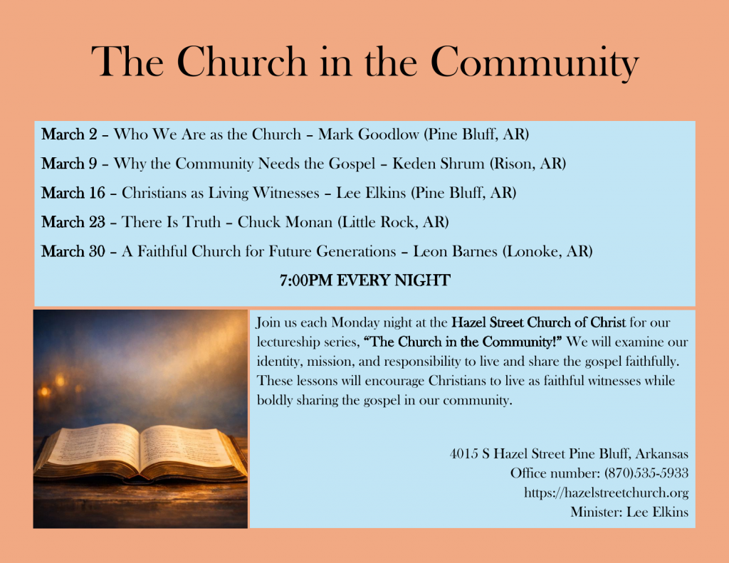 We are excited to invite you to our March Monday Night Lectureship Series at the Hazel Street Church of Christ!